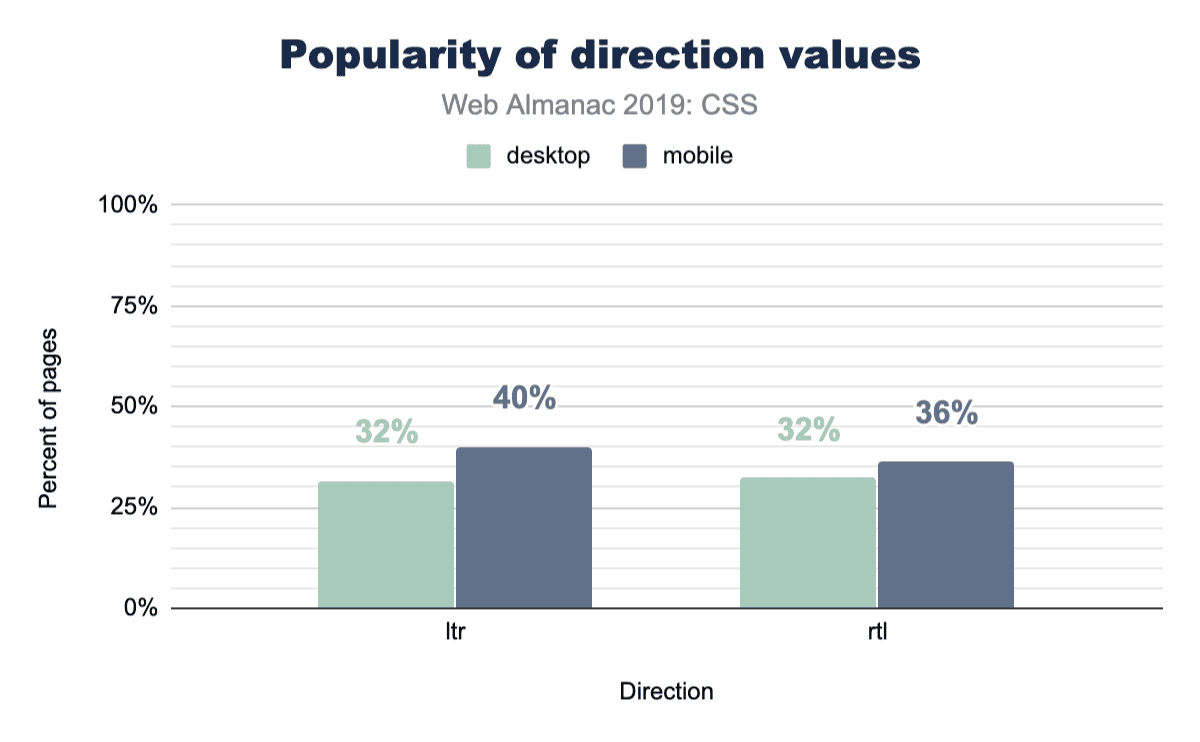 We estimate that the hegemony of margin-left and padding-top is of limited duration, soon to be supplemented by their writing direction agnostic, successive, logical property syntax. While we’re optimistic, current usage is quite low at 0.67% usage on desktop pages. To us, this feels like a habit change we’ll need to develop as an industry, while hopefully training new developers to use the new syntax.