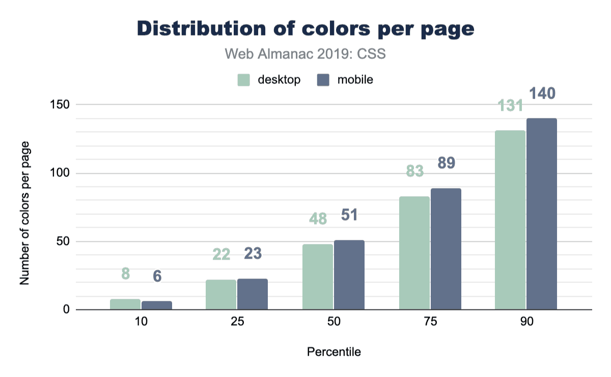 How many different font colors are used across the web? So this isn’t the total number of unique colors; rather, it’s how many different colors are used just for text. The numbers in this chart are quite high, and from experience, we know that without CSS variables, spacing, sizes and colors can quickly get away from you and fragment into lots of tiny values across your styles. These numbers reflect a difficulty of style management, and we hope this helps create some perspective for you to bring back to your teams or projects. How can you reduce this number into a manageable and reasonable amount?