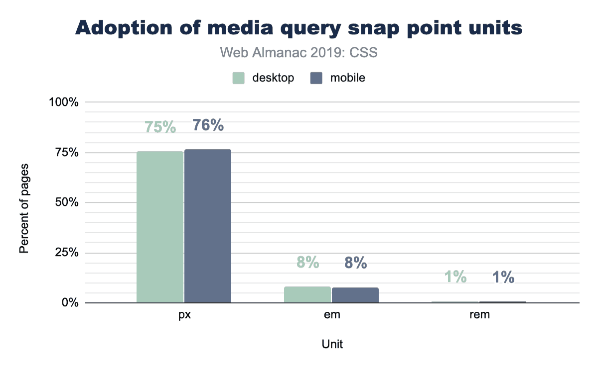 We saw larger differences in unit types when it comes to mobile and desktop usage for viewport-based units. 36.8% of mobile sites use vh (viewport height), while only 31% of desktop sites do. We also found that vh is more common than vw (viewport width) by about 11%. vmin (viewport minimum) is more popular than vmax (viewport maximum), with about 8% usage of vmin on mobile while vmax is only used by 1% of websites.