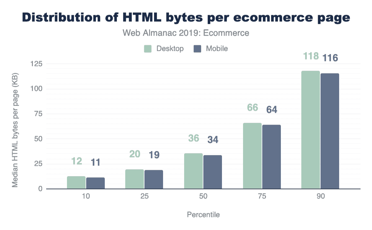 Note that HTML payloads may include other code such as inline JSON, JavaScript, or CSS directly in the markup itself, rather than referenced as external links. The median HTML payload size for ecommerce pages is 34 KB on mobile and 36 KB on desktop. However, 10% of ecommerce pages have an HTML payload of more than 115 KB.