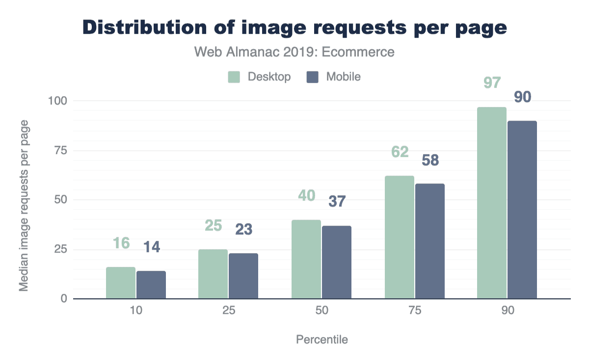 A significant proportion of ecommerce pages have sizable image payloads and make a large number of image requests on first load. See HTTP Archive’s State of Images report and the media and page weight chapters for more context.