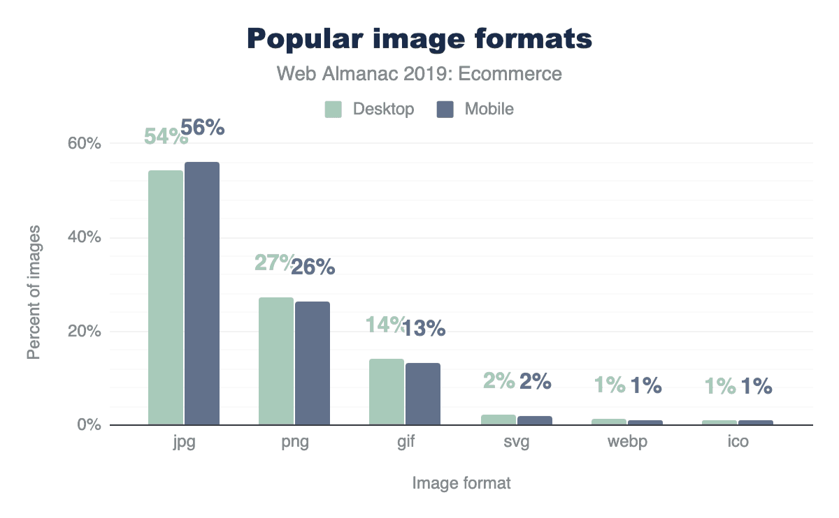 Only 1% of images on ecommerce platforms are WebP, which tallies with the authors’ experience of site reviews and partner work. WebP is supported by all modern browsers other than Safari and has good fallback mechanisms available. WebP supports transparency and is a far more efficient format than PNG for photographic images (see PNG section above).
