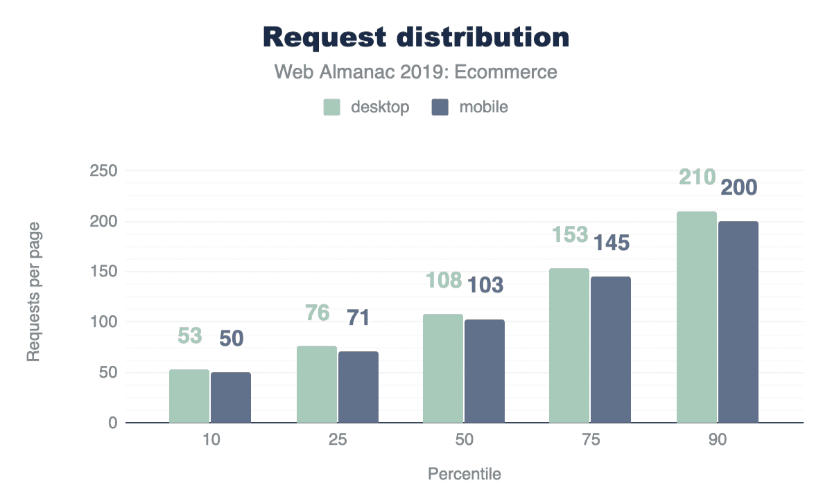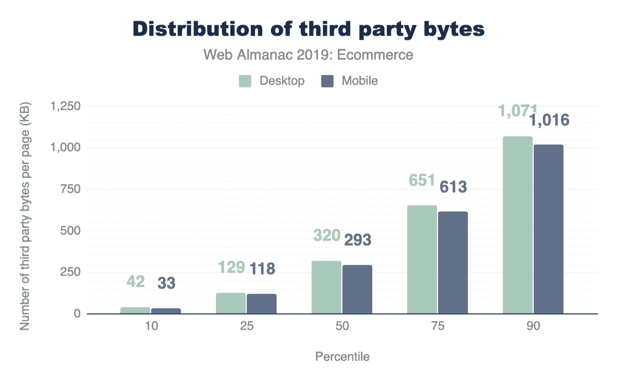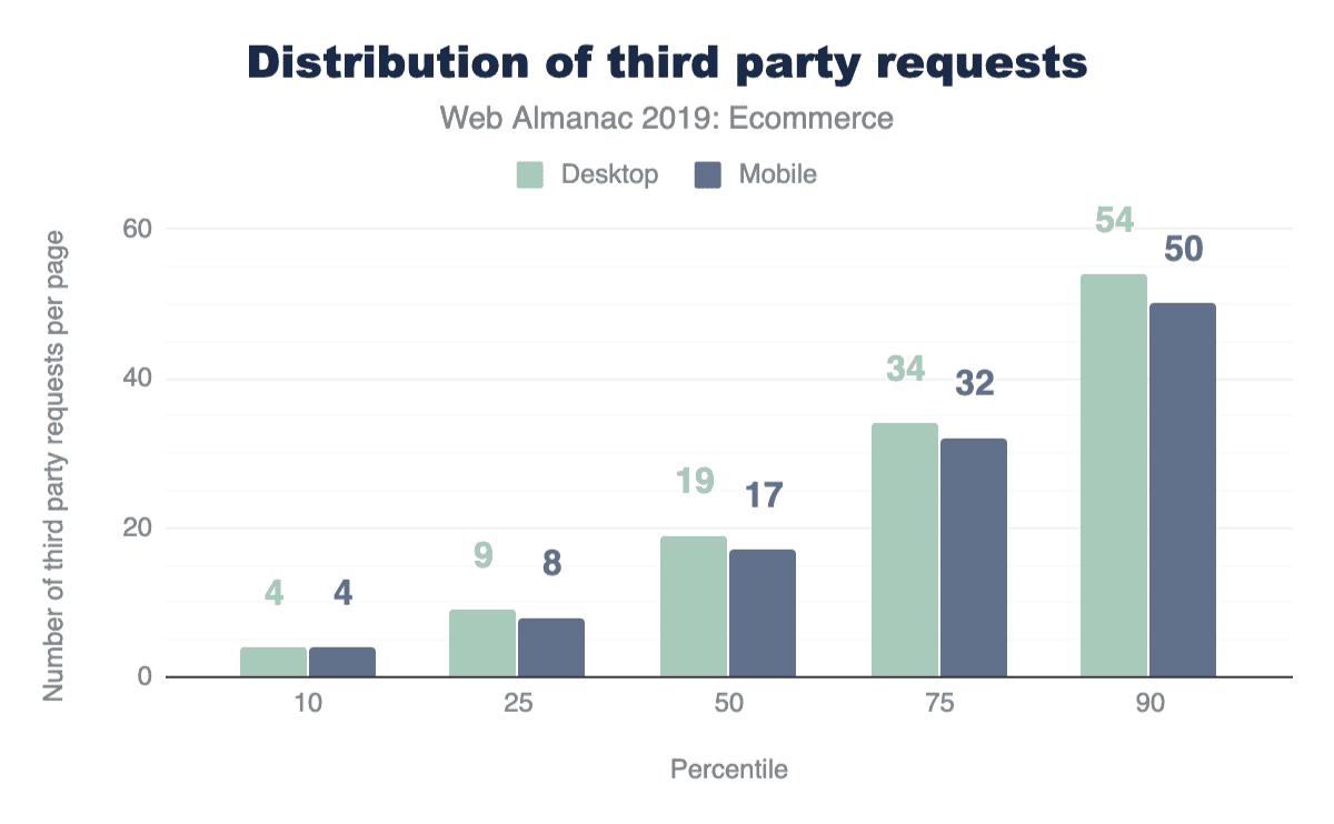 The median (’mid-range’) home page on an ecommerce platform makes 17 requests for third-party content on mobile and 19 on desktop. 10% of all home pages on ecommerce platforms make over 50 requests for third-party content, with a total payload of over 1 MB.