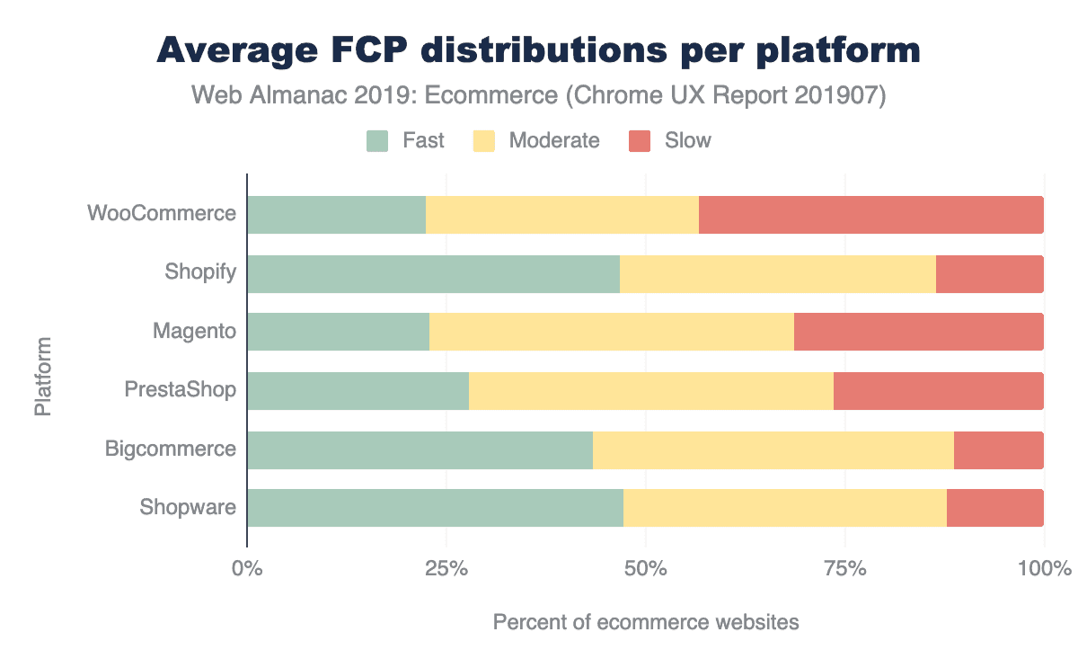 All top-six ecommerce platforms have worse FCP on mobile than desktop: less fast and more slow. Note that FCP is affected by device capability (processing power, memory, etc.) as well as connectivity.