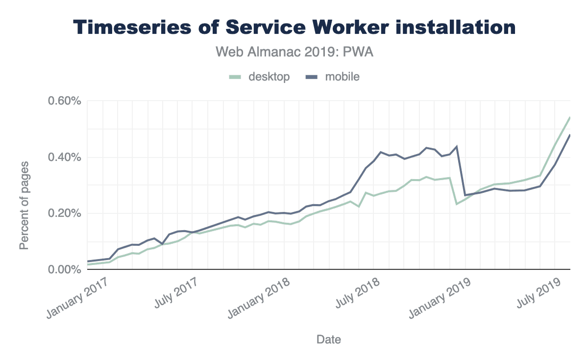 Figure 11.2. Service Worker installation over time for desktop and mobile.