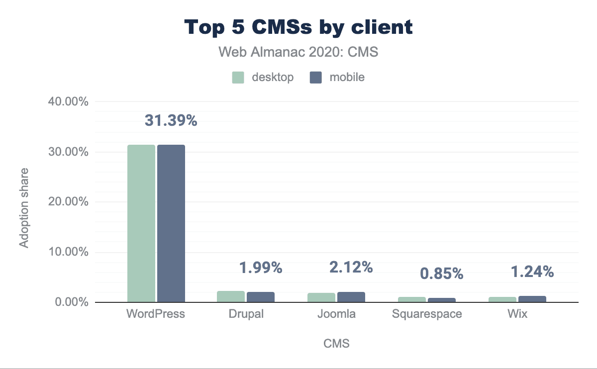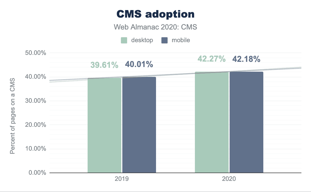 More than 42% of web pages are powered by a CMS platform, an increase of over 5% from 2019. This breaks down to 42.18% on desktop, up from 40.01% in 2019, and 42.27% on mobile, up from 39.61% in 2019.