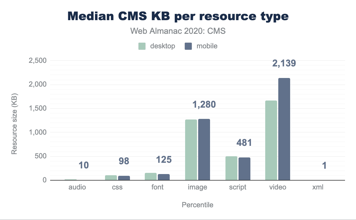 Page weights are important here. The average desktop CMS web page loads 2.4 MB of HTML, CSS, JavaScript, media, etc. 10% of pages, however, load over 7 MB of this data. On mobile devices the average web page loads 0.1 MB fewer than on desktop, with at least this number being true across all percentiles: