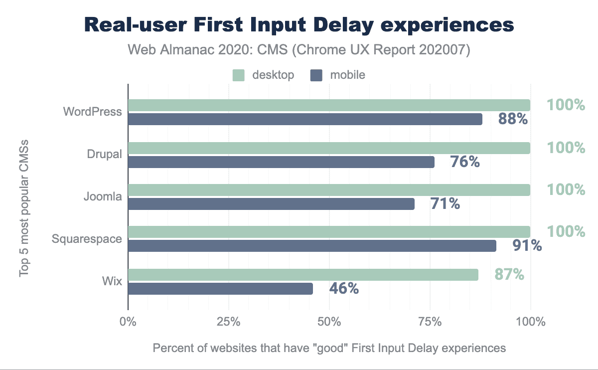 FID is very fast for the average CMS website on desktop–only Wix scores lower than 100%–and mixed on mobile. Most CMSs deliver mobile FID on an average site within a reasonable range of the desktop score. For Wix the number of websites that have a good FID on mobile is nearly half the desktop total.