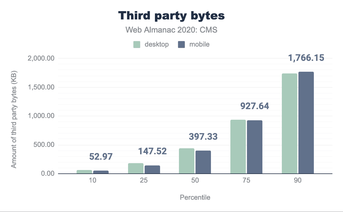 We find that the median desktop CMS page has 27 third-party requests with 436 KB of content, with the mobile equivalent generating 26 requests with 397 KB of content.