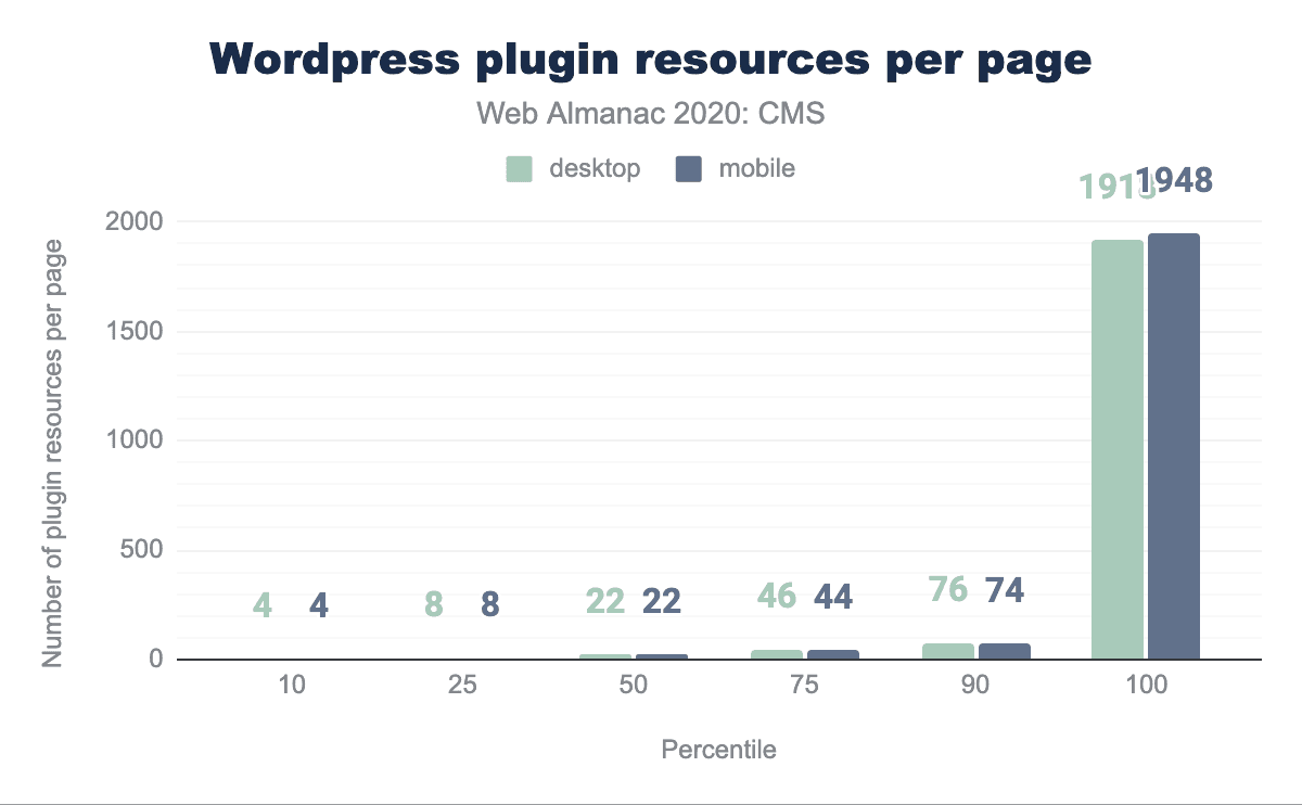 We explored how WordPress sites use these extensions, which are typically WordPress plugins. The median WordPress site (on desktop and mobile) loads 22 plugin resources per page, with sites at the 90th percentile loading 76 and 74 resources per page on desktop and mobile respectively. At the 100th percentile this goes as high as 1918 and 1948 resources per page on desktop and mobile respectively. Whilst we can’t compare this to other CMSs, it seems likely that WordPress’s extension ecosystem is a major contributor to its high adoption rate.