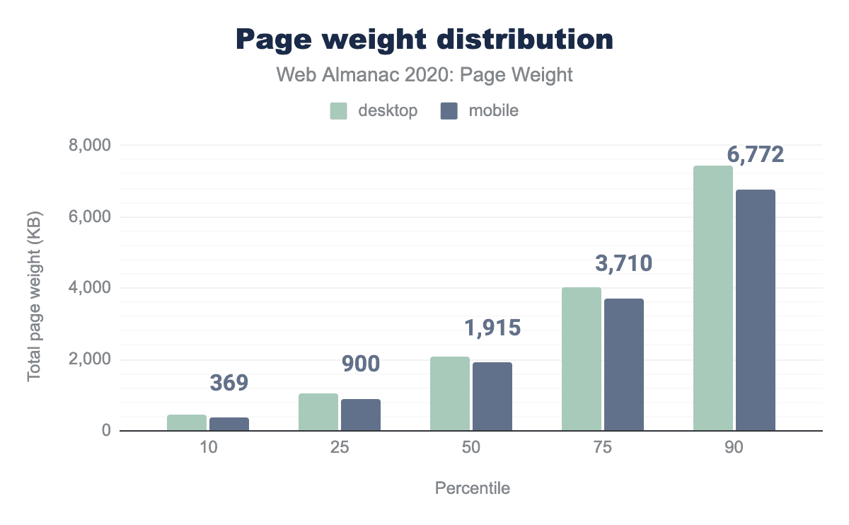We can however surmise from this the following: we are closing in on 7 MB of page weight on mobile and 7.5 MB on desktop at the 90th percentile. The data is following an age old trend: growth in page weight is on the upward trajectory yet again, from the previous year.