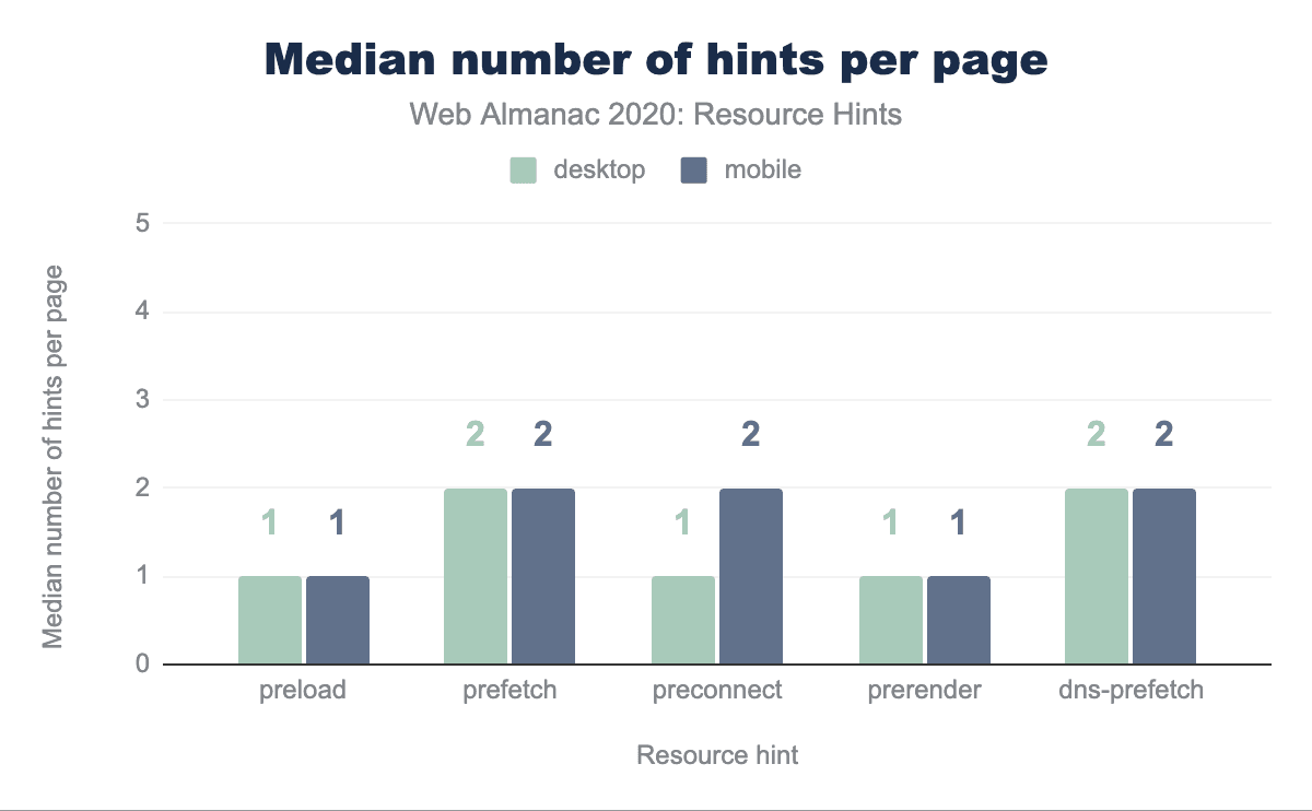preload and prerender both have (median) one hint per page on both mobile and desktop. prefetch and dns-prefetch both have (median) two hints per page on both mobile and desktop. preconnect has (median) one hint per page on desktop, and (median) two hints per page on mobile.Resource hints are most effective when they’re used selectively (“when everything is important, nothing is”). Having a more clear definition of what resources help improve critical rendering, versus future navigation optimizations, can move the focus away from using preconnect and more towards prefetch by shifting some of the resource prioritization and freeing up bandwidth for what most helps the user at first.
