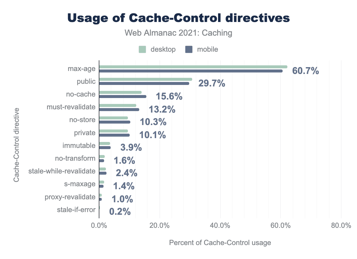 Cache-Control directives. The usage for desktop ranges from 62.2% for max-age, 29.7% for public, 16.5% for no-cache, 12.2% for must-revalidate, 9.6% for no-store, 9.5% for private, 3.5% for immutable, 1.8% for no-transform, 2.3% for stale-while-revalidate, 1.6% for s-maxage, 0.9% for proxy-revalidate , and 0.2% for stale-if-error. Usage for mobile ranges from 60.7% for max-age, 29.7% for public, 15.6% for no-cache, 13.2% for must-revalidate, 10.3% for no-store, 10.1% for private, 3.9% for immutable, 1.6% for no-transform, 2.4% for stale-while-revalidate, 1.4% for s-maxage, 1.0% for proxy-revalidate , and 0.2% for stale-if-error.Cache-Control directives.
