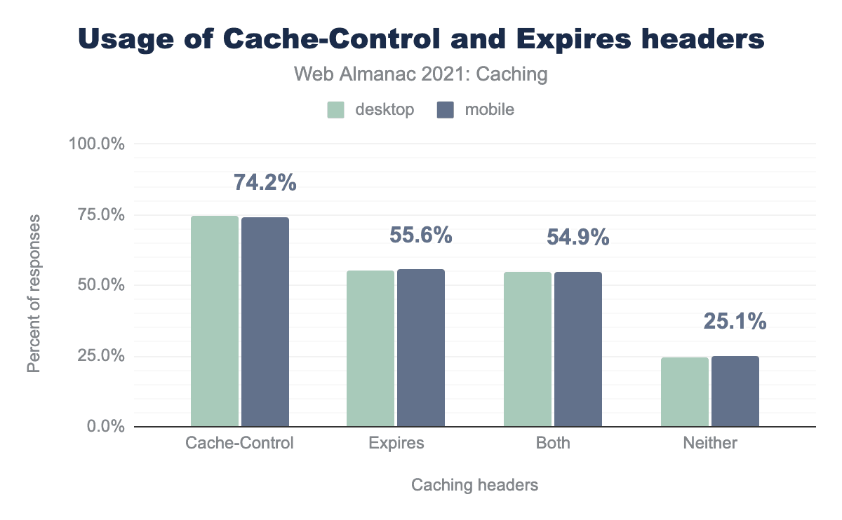 Usage of the Cache-Control header has increased steadily since 2019. 74.2% of responses on mobile requests included the Cache-Control header, while 74.8% of responses on desktop requests utilized the header.