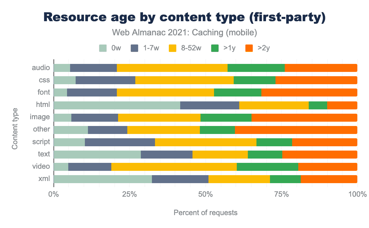 Audio was the most highly cached resource across both first and third parties. However, the resource age varied greatly between first-party (averaging 8-52 weeks) and third-party, at only 1-7 weeks. Audio resources in first-party situations tend to be updated less frequently (why?), so third parties may be capitalizing on a caching opportunity by offering fresher resources.