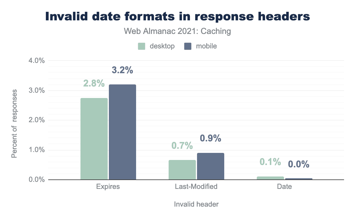 Expires, 0.7% for Last-Modified, and 0.1% for Date. The percent of responses for mobile range from 3.2% for Expires, 0.9% for Last-Modified, and 0.0% for Date.Between 2020 and 2021, the percent using invalid Date improved by 0.5% but worsened for Last-Modified and Expires showing that it was related to how the date was set on caching.