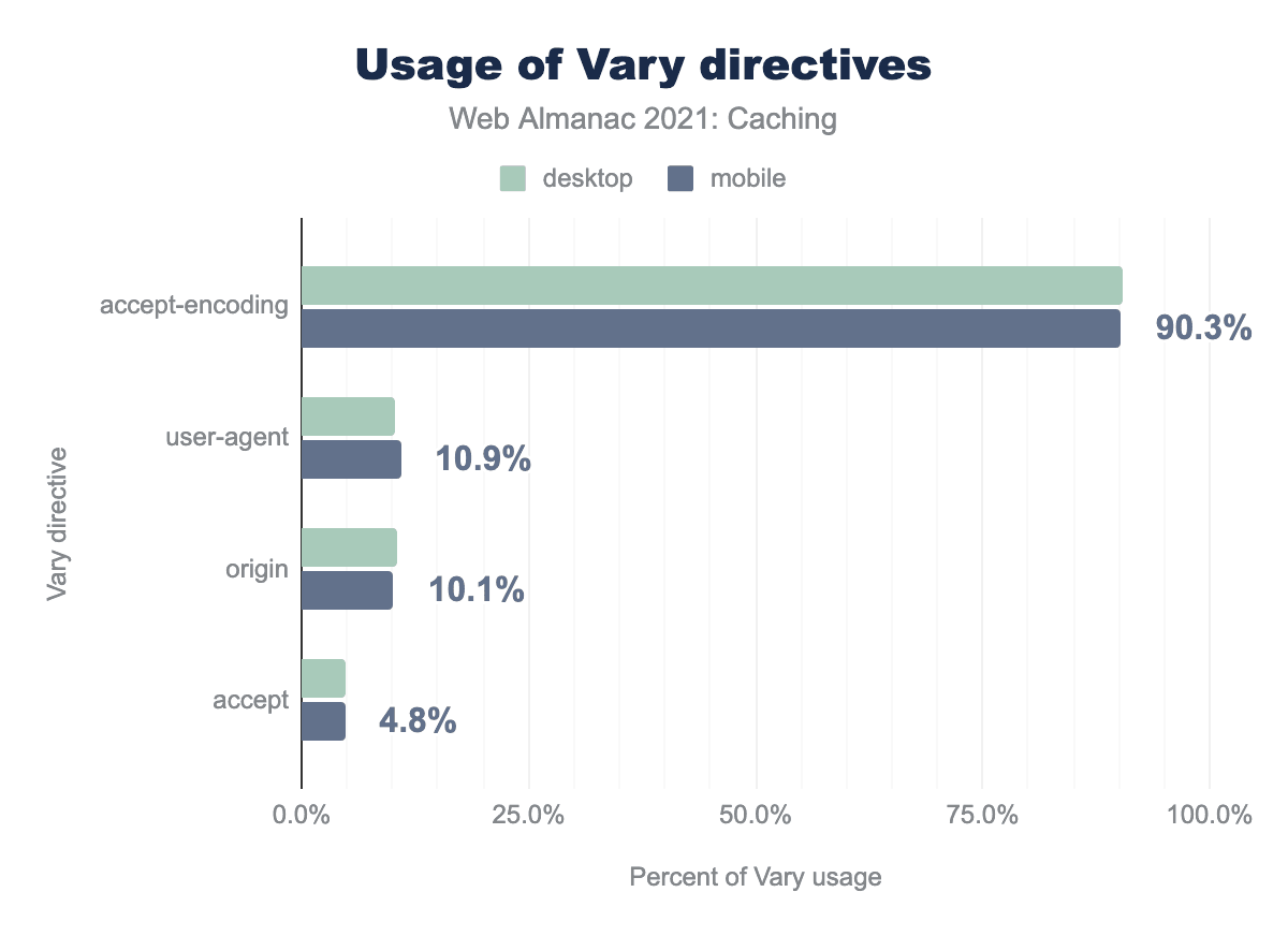 Vary header. 90.4% of desktop responses use Accept-Encoding, much smaller values for the rest with 10.2% for User-Agent, approximately 10.5% for Origin, and 5.0% for Accept. 90.3% of mobile responses use of Accept-Encoding, much smaller values for the rest with 10.9% for User-Agent, approximately 10.1% for Origin, and 4.8% for Accept.Vary directives.