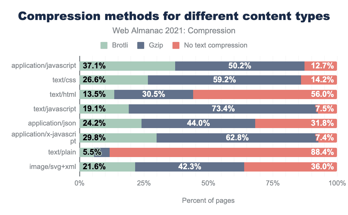 text/plain and text/html are the only content types that are compressed less than 50% of the time. application/json is compressed approximately 68% of the time, image/svg+xml approximately 64%. text/css and application/javascript are each compressed over 85% of the time, and application/x-javascript and text/javascript are compressed more than 90% of the time.Compared to the other content types, text/plain and text/html use the least amount of compression, with merely 12% and 14% using compression at all. This might be because text/html is more often dynamically generated than static content such as JavaScript and CSS, even though compressing dynamically generated content also has a positive impact. More analysis about the compression of JavaScript content is available in the JavaScript chapter.