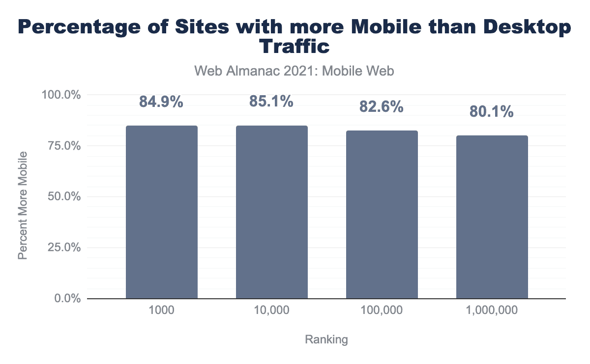 When grouped by CrUX ranking (the top 1,000, 10,000 and so on origins by traffic in the dataset), the more traffic a site receives, there is a slight increase of the percentage of traffic it gets from mobile, all except the top 1,000, which get slightly less (84.9% vs. 85.1%) mobile vs. desktop.