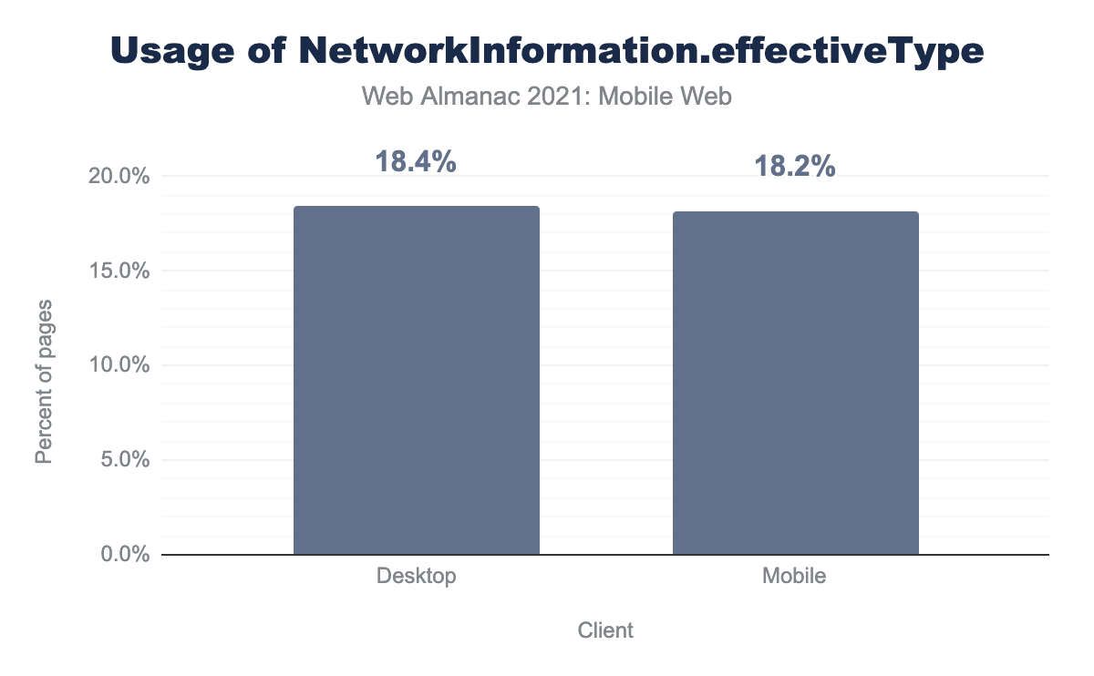 18.2% of mobile requests had page loads utilizing NetworkInformation.effectiveType, but surprisingly, a very slightly higher 18.4% of desktop requests detected use of this API.