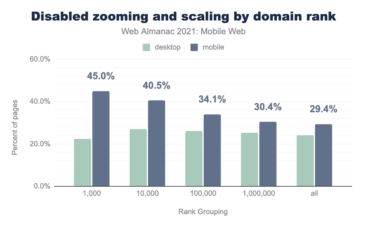 Disappointingly, 29.4% of mobile page loads fail this requirement, and contained a viewport that prevented zooming, this is a slight improvement over the 30.7% (source: 2020 Web Almanac Accessibility chapter).