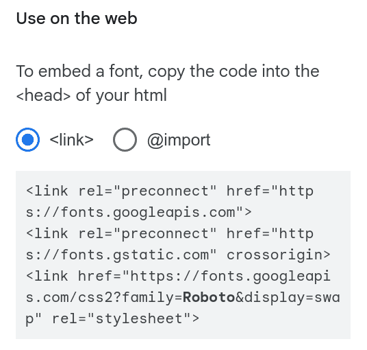 <head> of your html”. Code snippet states <link rel="preconnect" href="https://fonts.googleapis.com"><link rel="preconnect" href="https://fonts.gstatic.com" crossorigin><link href="https://fonts.googleapis.com/css2?family=Roboto&display=swap" rel="stylesheet">Google Fonts now includes instructions to preconnect to both the fonts.gstatic.com origin and fonts.googleapis.com, which is usually good practice to offset the impact of these late discovered resources.