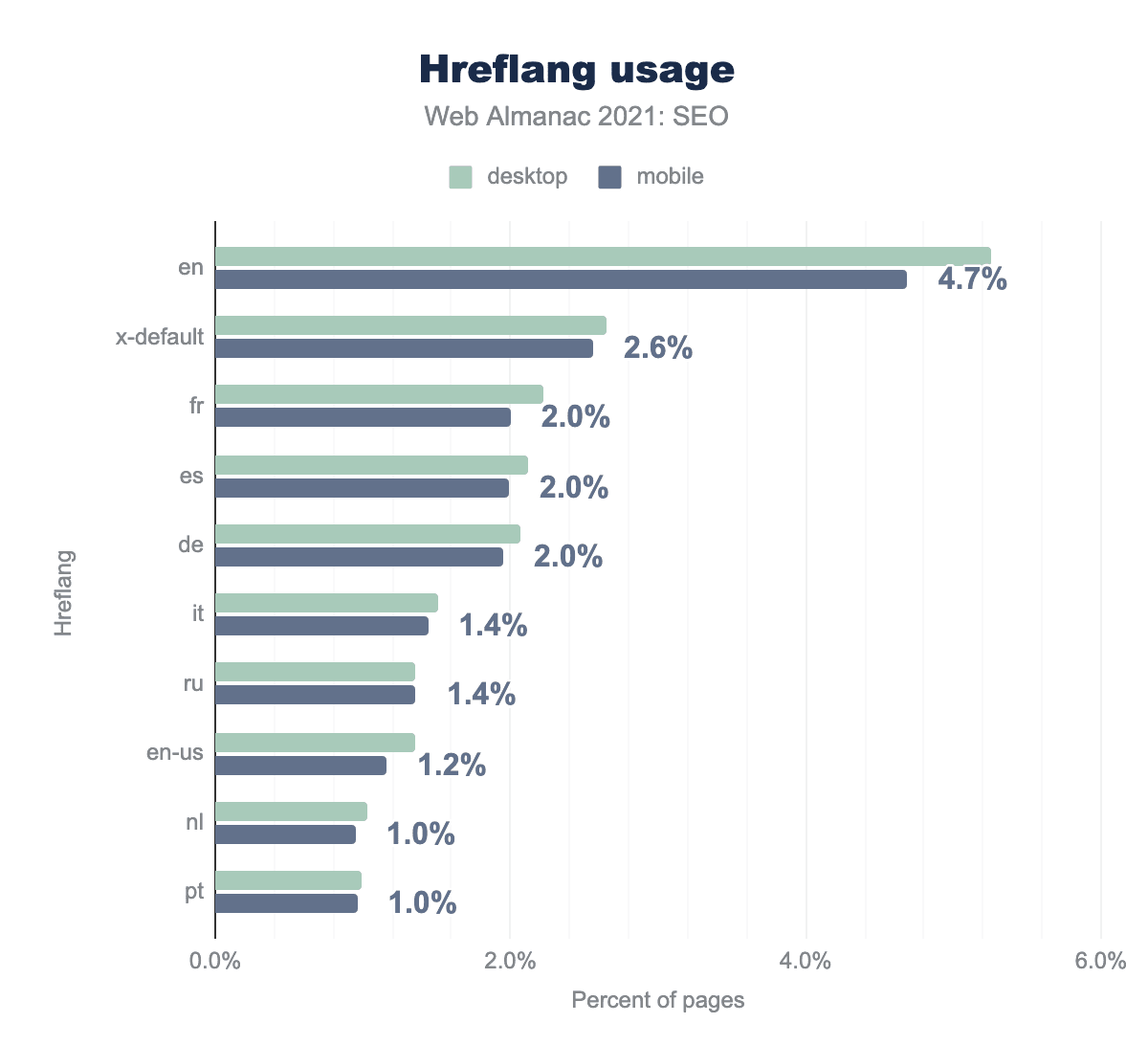 en (English version) and hreflang attributes (across all languages) were implemented on less than 5% of desktop and mobile pages.9.0% of desktop pages and 8.4% of mobile pages use the hreflang attribute.