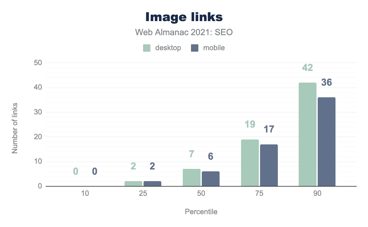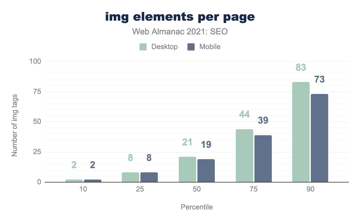 <img> elements per page per percentile (10, 25, 50, 75, and 90). The median desktop page featured 21 <img> elements and the median mobile page featured 19 <img> elements.Images can directly and indirectly impact SEO as they impact image search rankings and page performance.