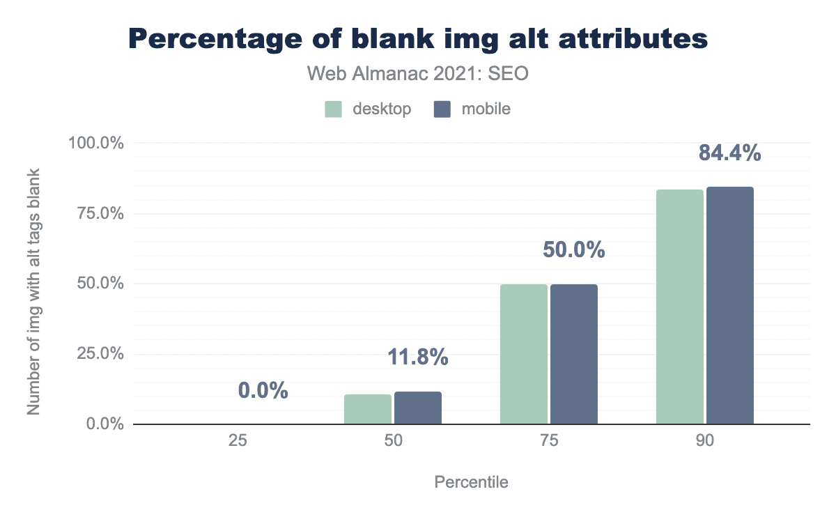 alt attributes present per percentile (10, 25, 50, 75, and 90). Our data found the median web page contained 54.6% of images with an alt attribute on mobile pages and 56.5% on desktop pages.alt attributes.