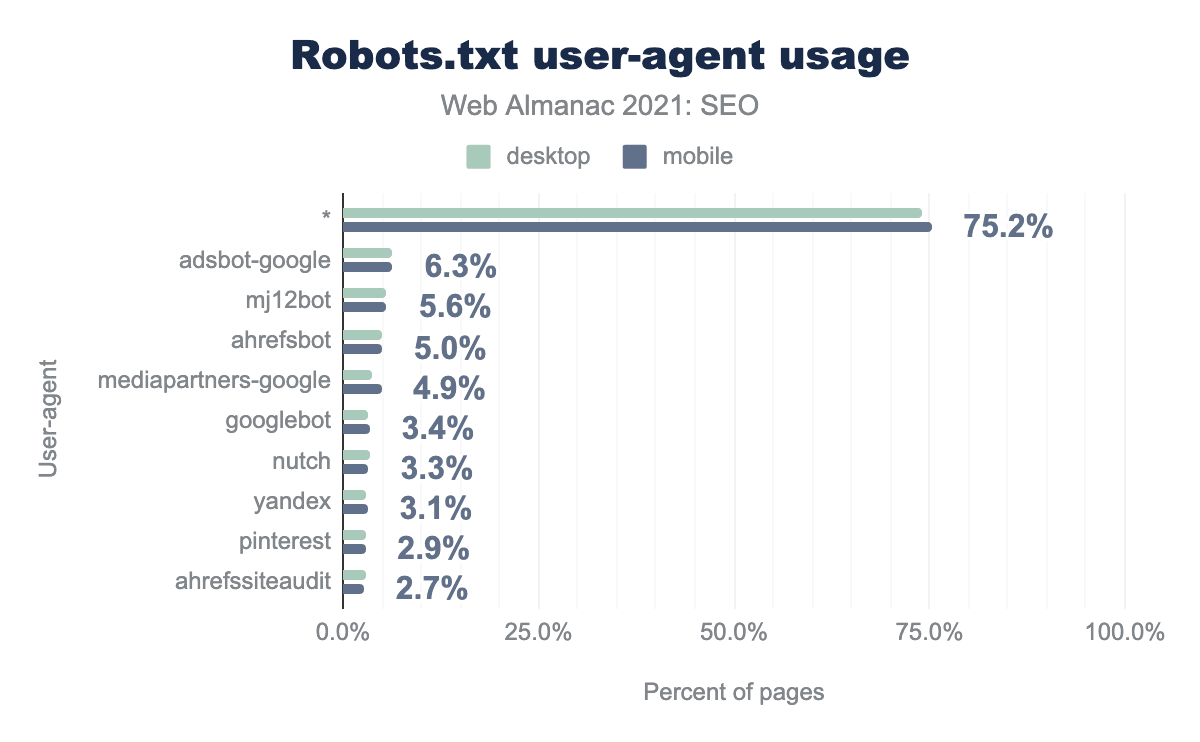 adsbot-google, 5.6% for mj12bot, 5.0% for ahrefsbot, 4.9% for mediapartners-google, 3.4% for googlebot, 3.3% for nutch, 3.1% for yandex, 2.9% for pinterest, 2.7% for ahrefssiteaudit.robots.txt user-agent usage.