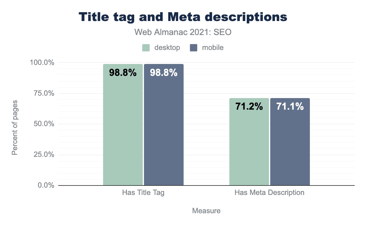 title element and 71.1% of mobile and desktop pages had a meta description.In 2021, 98.8% of desktop and mobile pages had <title> elements. 71.1% of desktop and mobile home pages had <meta name="description"> tags.