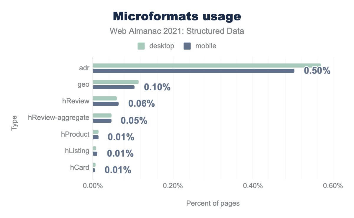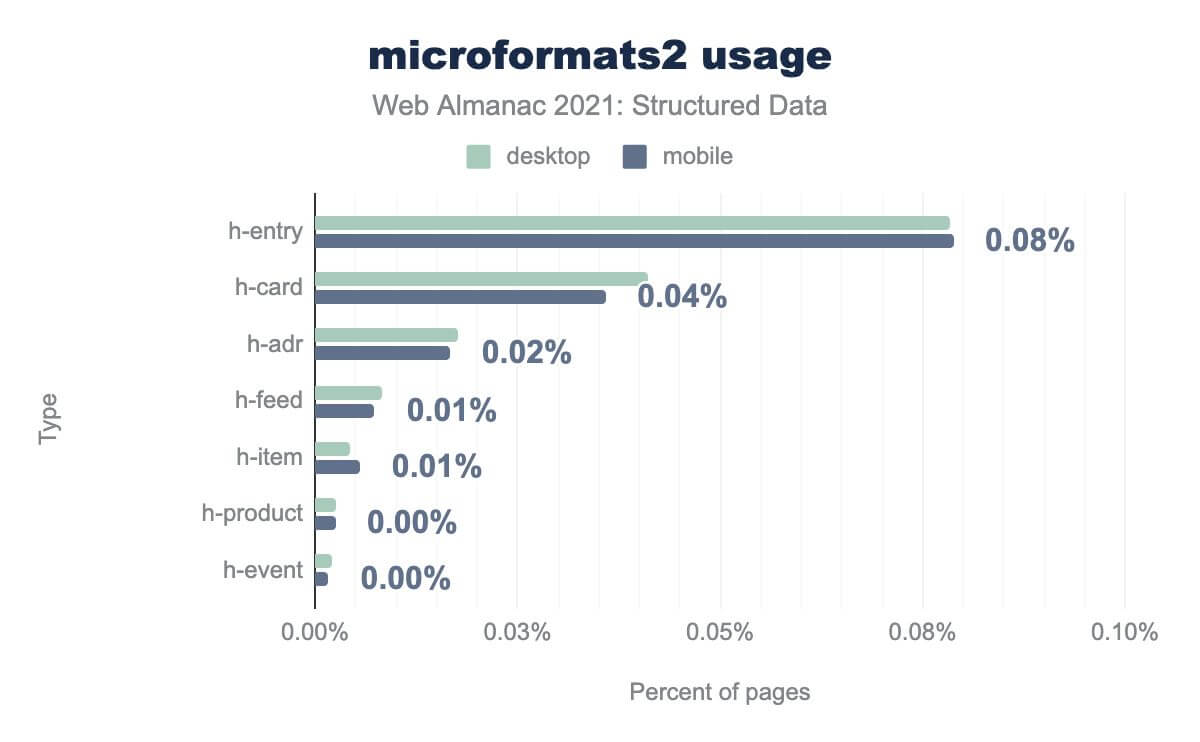 h-entry is on 0.08% h-card is on 0.04% h-adr is on 0.02% h-feed is on 0.01% h-item is on 0.01% h-product is on less than 0.01%, and h-event is on less than 0.01%. Desktop usage is similar.The difference between legacy microformats and the more modern version is significant, and an interesting insight into changing behaviors and preferences in the use of markup.