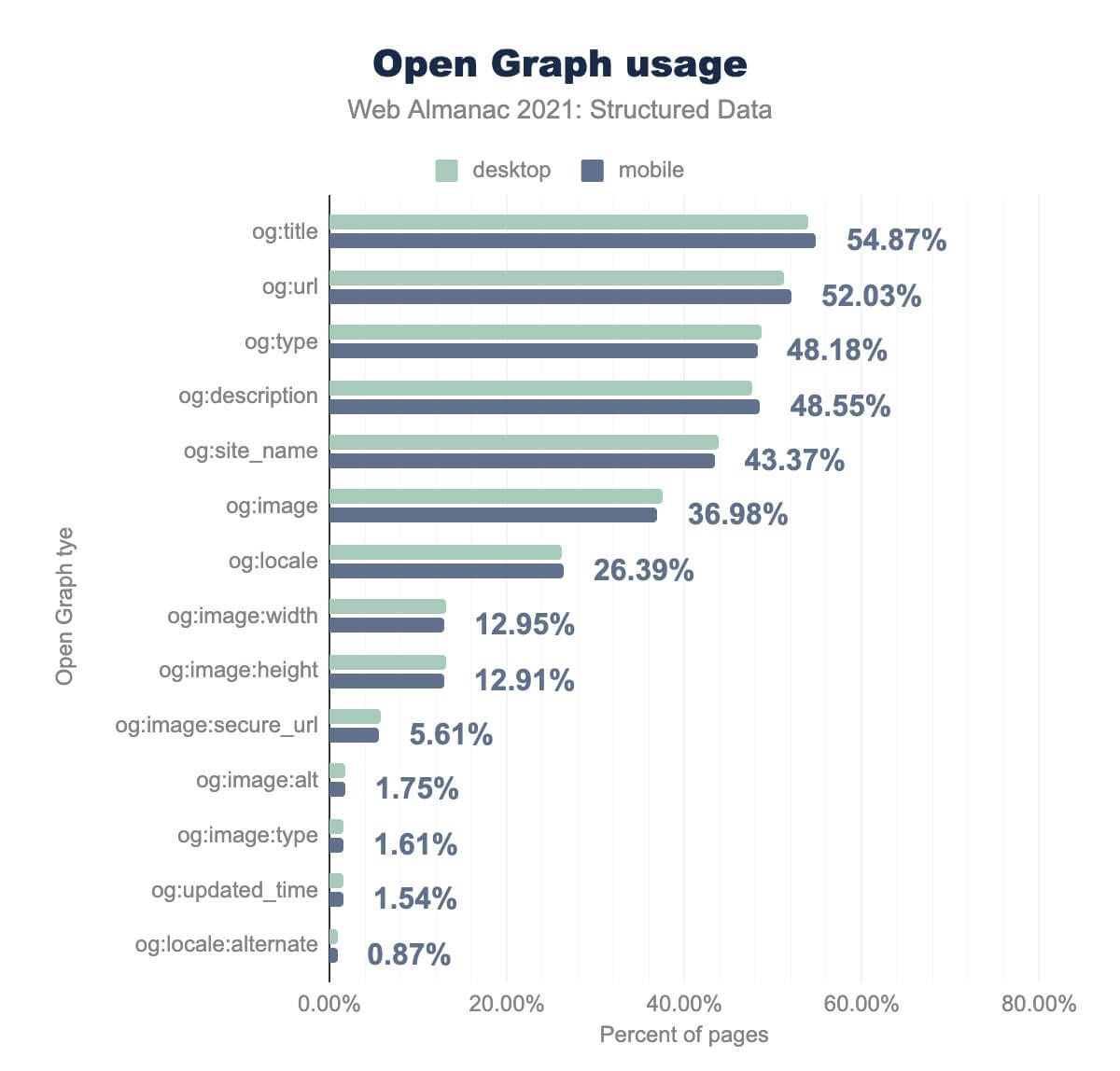 og:title is on 54.87%, og:url is on 52.03%, og:type is on 48.18%, og:description is on 48.55%, og:site_name is on 43.37%, og:image is on 36.98%, og:locale is on 26.39%, og:image:width is on 12.95%, og:image:height is on 12.91%, og:image:secure_url is on 5.61%, og:image:alt is on 1.75%, og:image:type is on 1.61%, og:updated_time is on 1.54%, and og:locale:alternate is on 0.87%. Desktop usage is similar.The most common type of Open Graph tag is the og:title, which can be found on an incredible 54.87% of pages. That’s followed closely by a set of related attributes, which describe what type of thing is being represented (e.g., og:type, on 48.18% of pages) and how it should be represented (e.g., og:description, on 48.55% of pages).