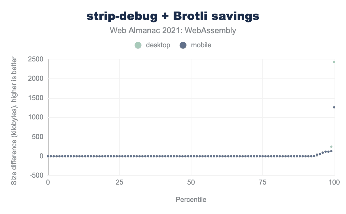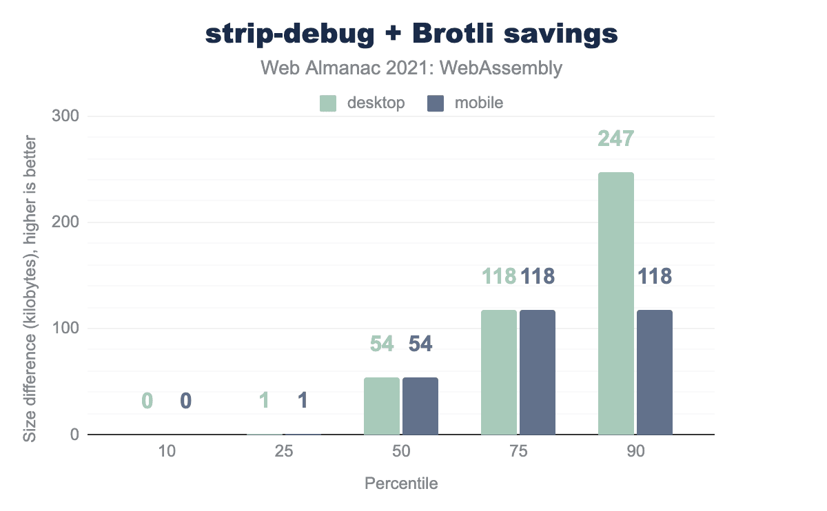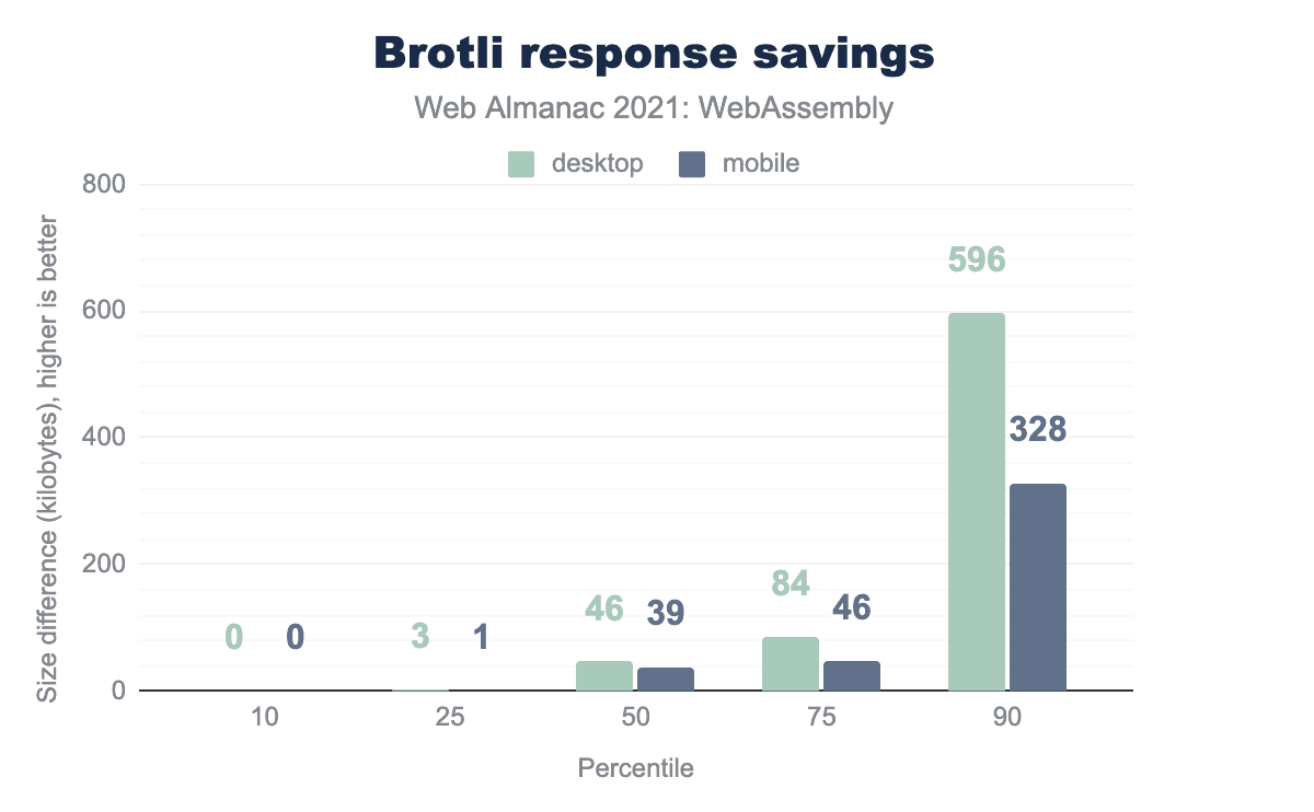 Median savings are around 40 KB. The top 10% save just under 600 KB on desktop and 330 KB on mobile. The largest savings produced reach as much as 35 MB / 21 MB. Those differences speak in favor of enabling Brotli compression whenever possible, at least for WebAssembly content.