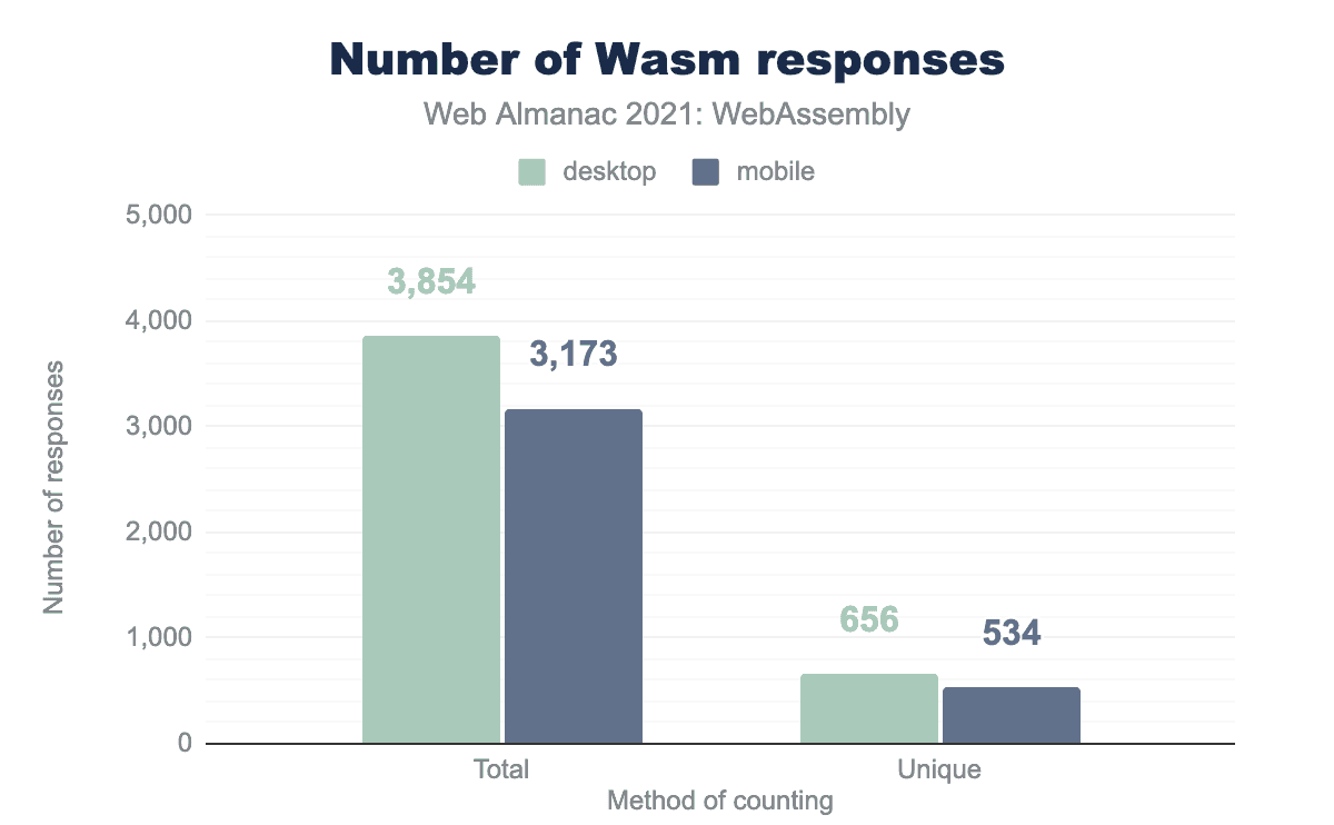 We got 3854 confirmed WebAssembly requests on desktop and 3173 on mobile. Those Wasm modules are used across 2724 domains on desktop and 2300 domains on mobile, which represents 0.06% and 0.04% of all domains on desktop and mobile correspondingly.
