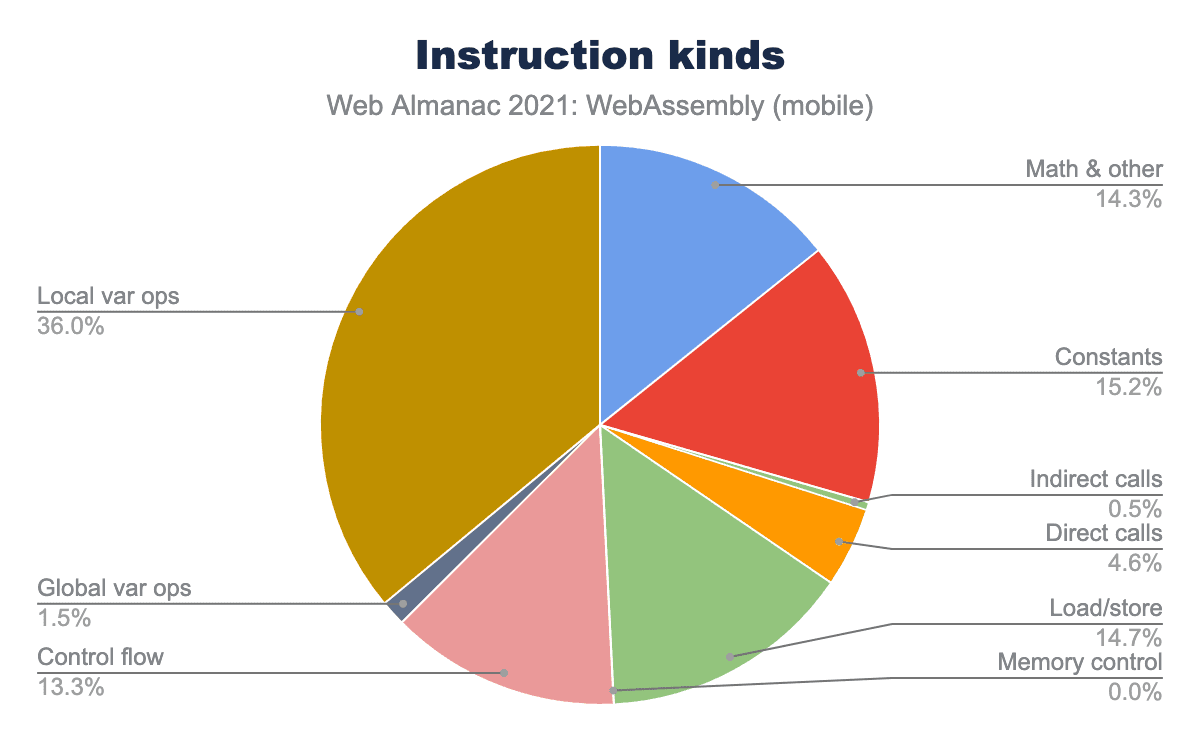 One surprising takeaway from this distribution is that local var operations—that is, local.get, local.set and local.tee—comprise the largest category—36%, far ahead from the next few categories—inline constants (15.2%), load/store operations (14.7%) and all the math and logical operations (14.3%). Local var operations are usually generated by compilers as a result of optimization passes in compilers. They downgrade expensive memory access operations to local variables where possible, so that engines can subsequently put those local variables into CPU registers, which makes them much cheaper to access.