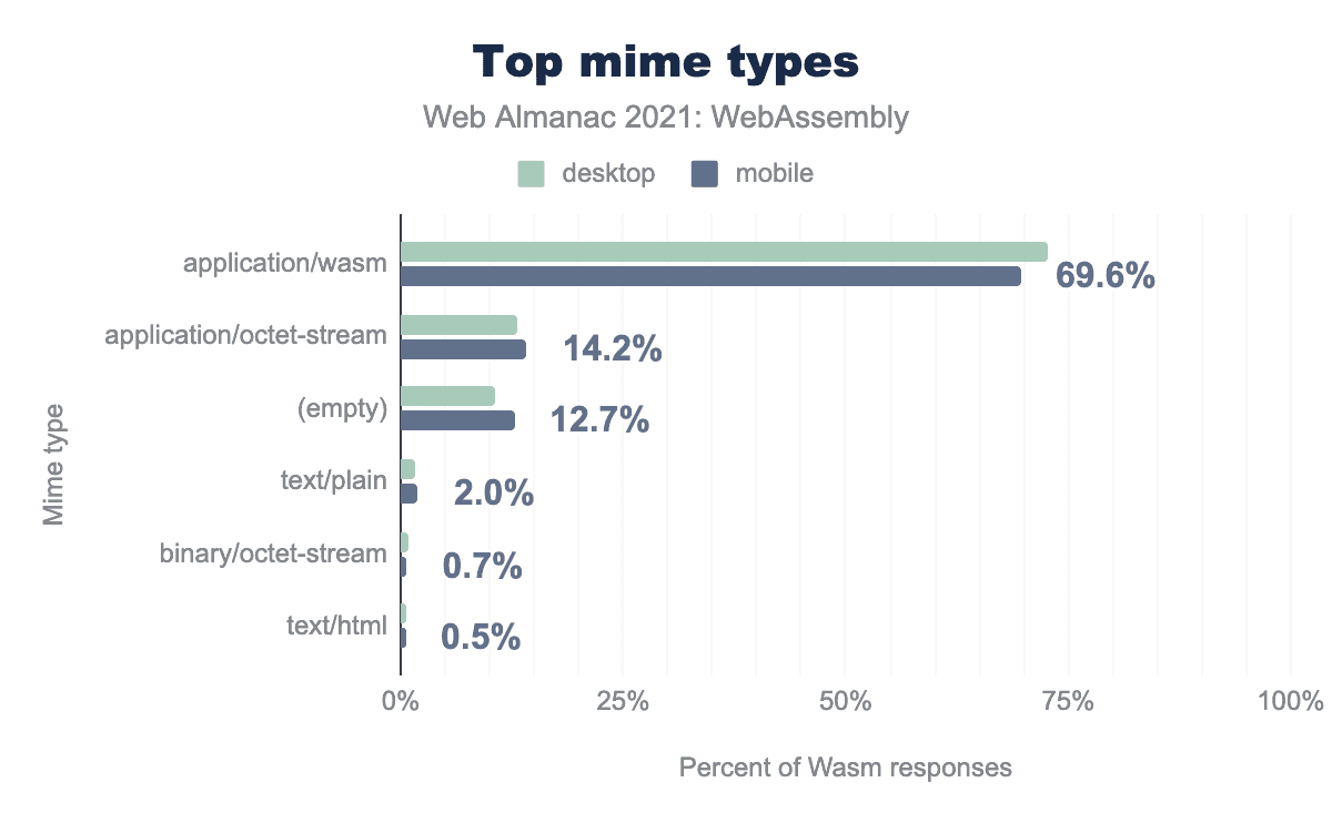 Interestingly, when we look at the most popular resulting mime-types, we can see that while Content-Type: application/wasm is by far the most popular, it doesn’t cover all the Wasm responses—good thing we included other URLs with .wasm extension too.