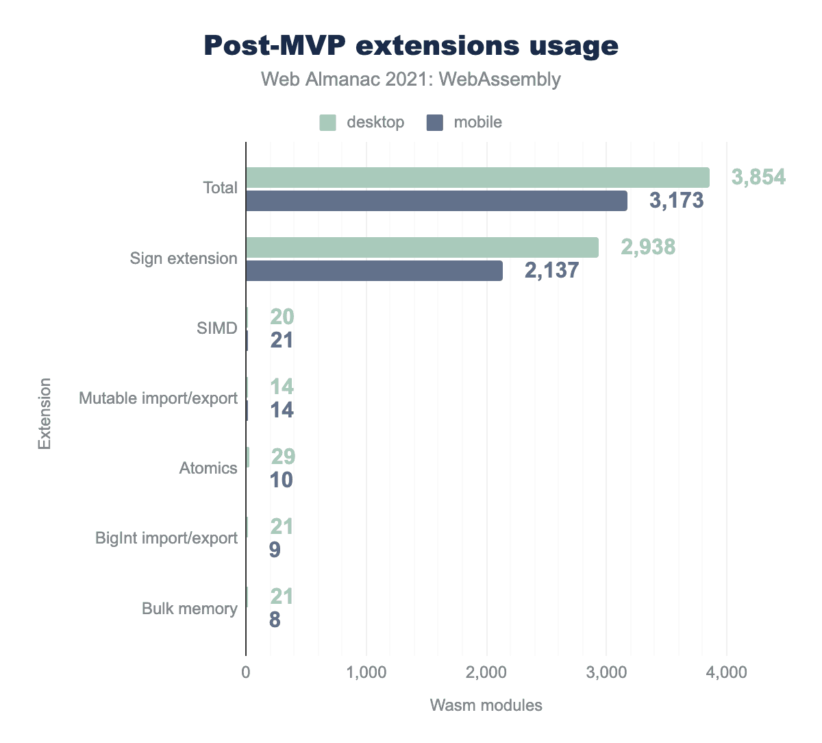 One feature stands out—it’s the sign-extension operators proposal. It was shipped in all browsers not too long after the MVP, and enabled in LLVM (a compiler backend used by Clang / Emscripten and Rust) by default, which explains its high adoption rate. All other features currently have to be enabled explicitly by the developer at compilation time.