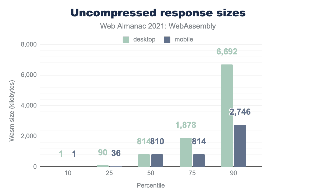 The largest response in the HTTP Archive downloads about 44 MB of Wasm on desktop and 28 MB on mobile.