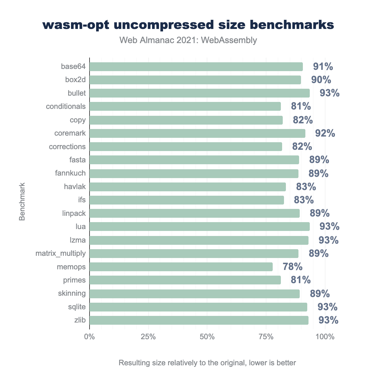 wasm-opt size benchmarks across a wide variety of real-world modules such as base64, box2d, lua, sqlite, zlib, etc. The resulting sizes vary from 78% to, worst-case, 93% of the original. Median is at 89%.wasm-opt uncompressed size benchmarks.