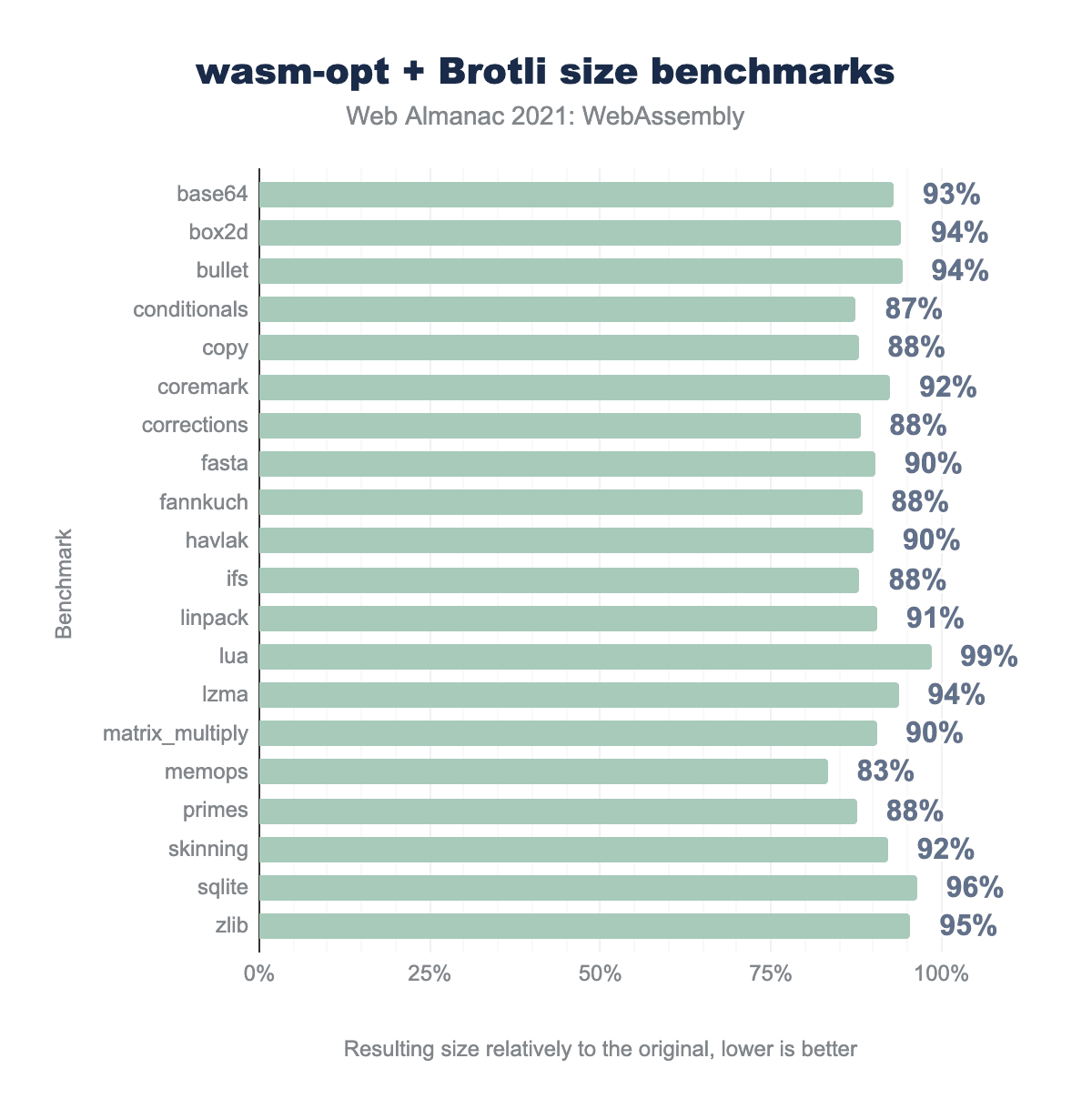 wasm-opt size benchmarks, but with Brotli compression applied to both original and resulting WebAssembly modules. Results vary from 83% to 99% with median at 91%.wasm-opt + Brotli size benchmarks.