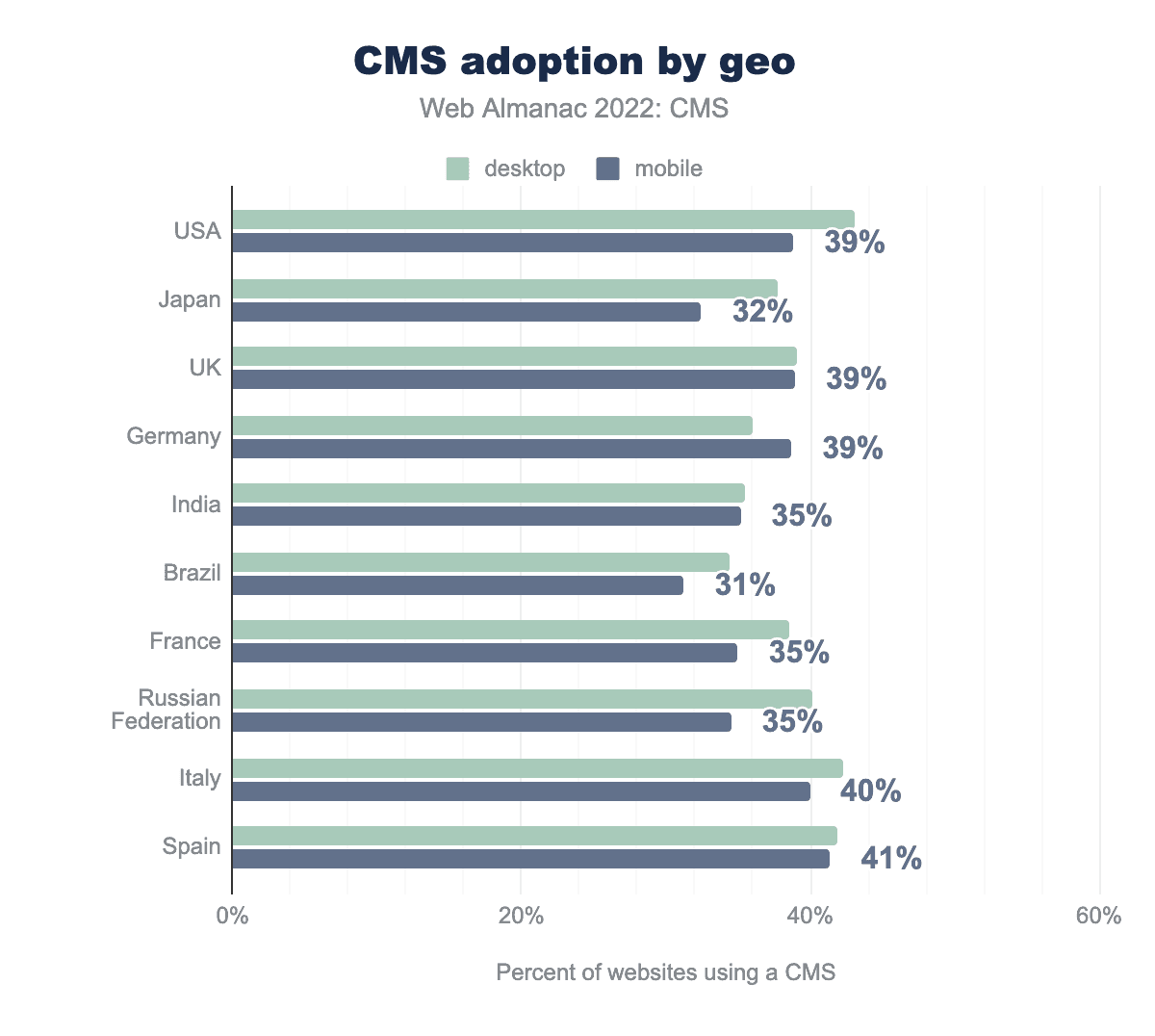 Of particular interest is the decrease across the board compared to our 2021 dataset when individual countries are considered. Comparing year-over-year for mobile results, all countries except India appear to show a drop, ranging from a 4% decrease for the UK and Germany to an 8% decrease for the US and Italy. Given the consistency of the decreases across geographies, it seems more plausible to be a variance in attribution than a wholesale drop in CMS adoption. We recommend evaluating this further in next year’s analysis.