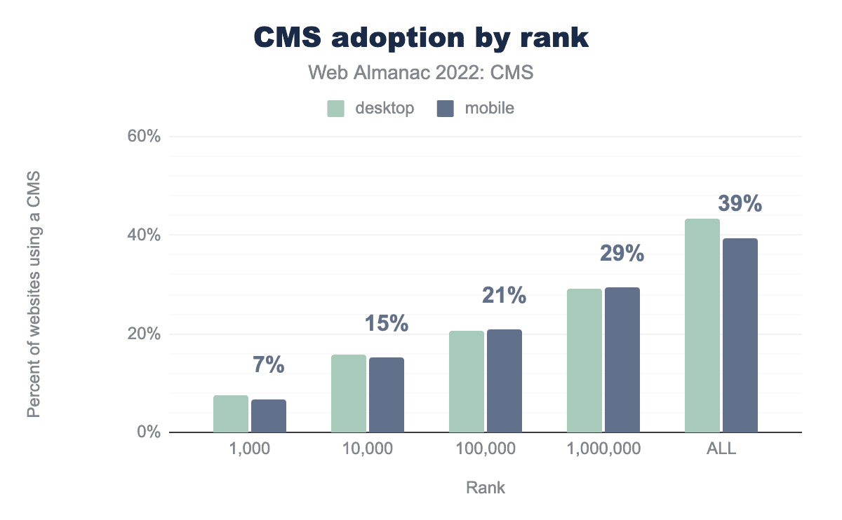 As of June 2022, 45% of the websites in the Web Almanac’s desktop dataset were powered by a CMS, indicating similar usage to 2021. The mobile dataset shows an increase from 46% in 2021 to 47% here in 2022. Looking closer at the desktop raw figures we actually see a slight drop in both absolute and percentage terms, but the drop is more likely an artifact of minor variances in attribution than an indicator of a downward trend in CMS usage. It should be noted that the number of desktop sites tracked by HTTP Archive (and the source CrUX dataset) has fallen considerably from 6.4 million sites to 5.4 million sites, while the number of mobile sites has grown by about 400,000 sites from 7.5 million to 7.9 million sites. We take this increase to reflect continued growth in mobile device usage at the expense of the desktop.