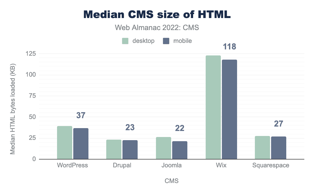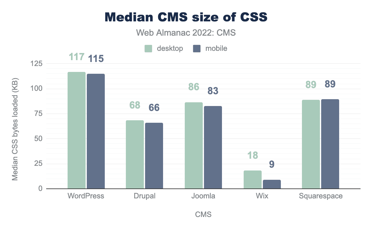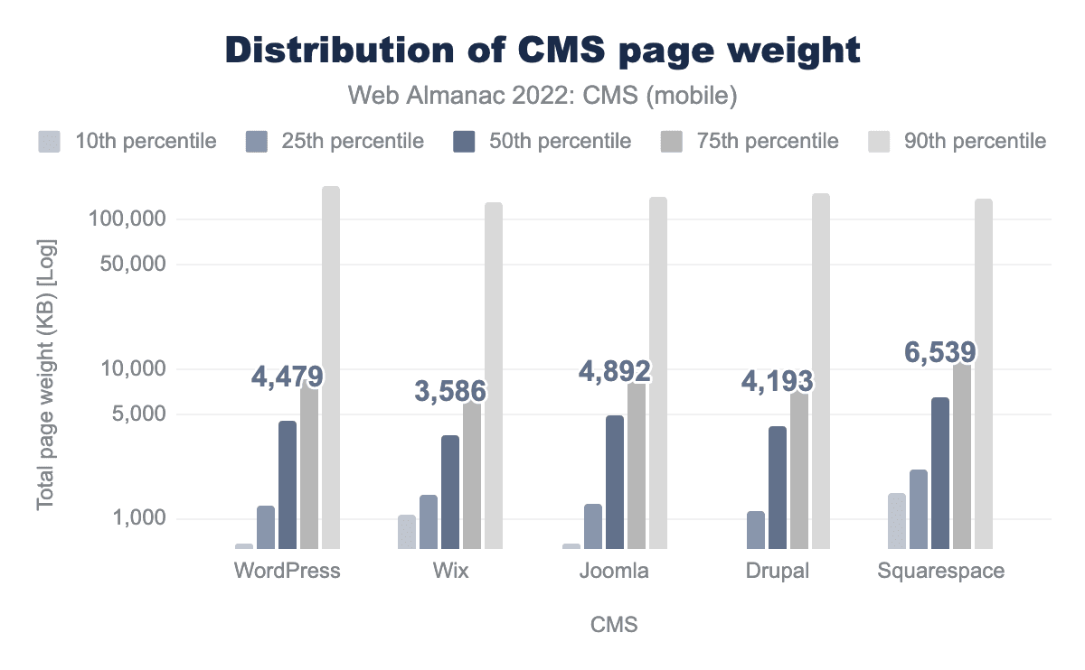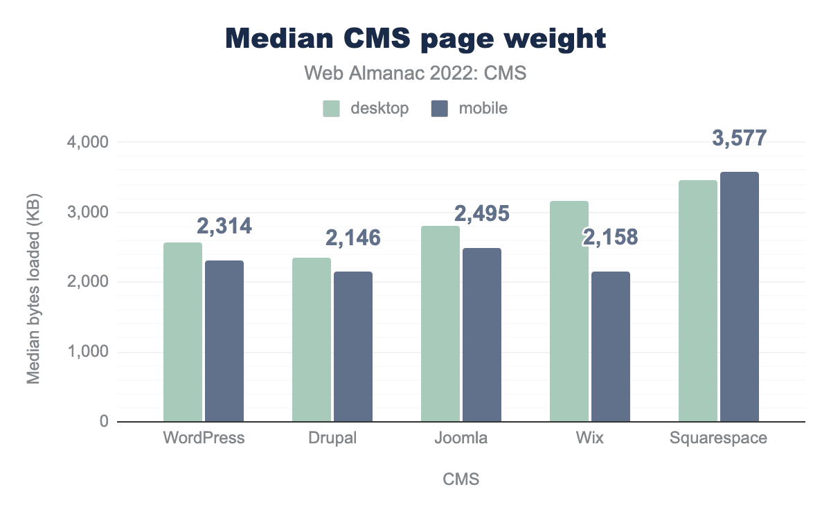 Most of the top five CMSs deliver a median page weight of around ~2 MB, except Squarespace which delivers a larger ~3.5 MB. All except Joomla showed increases in page weight over 2021 data.