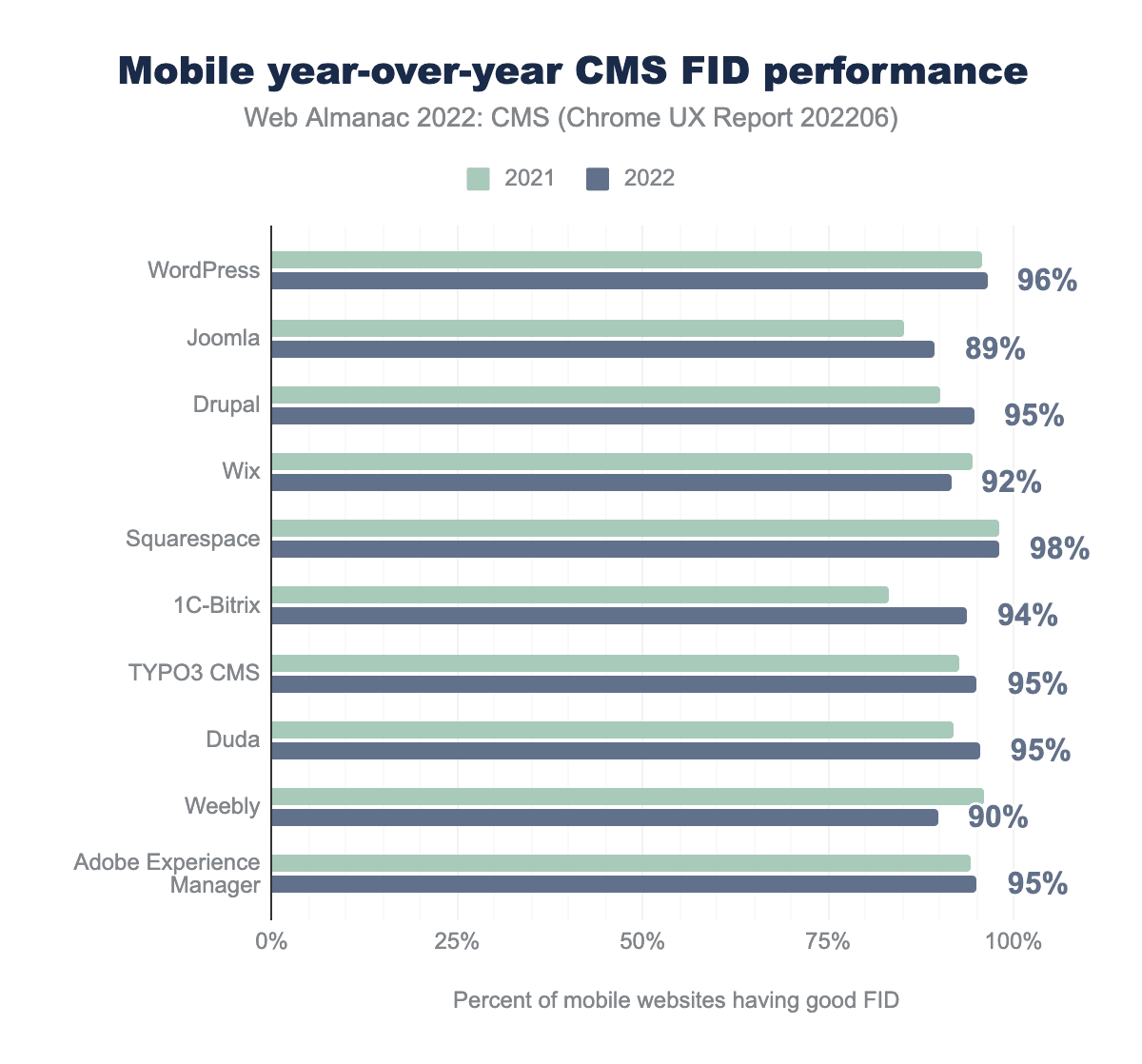 Yearly data shows that most CMSs managed to improve their FID over the past year. Wix and Weebly both regressed by several percentage points over the previous year’s data.