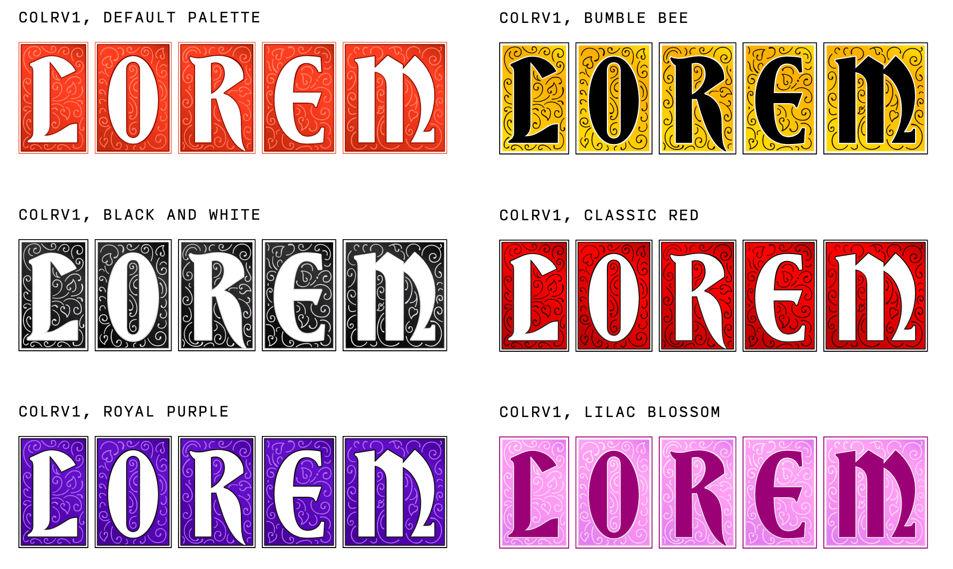 The CSS specification has been updated to support color fonts to allow selection and customization of palettes. Palettes are custom color schemes stored in the font by the type designer. The CSS font-palette property allows you to select a palette from the font and the @font-palette-values rule allows you to create new palettes or override existing ones. One of the more obvious use cases of this technology is to have light and dark mode palettes built right into the color font. There is a lot of unexplored potential there.