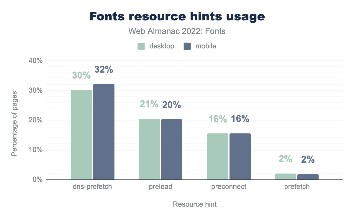 dns-prefetch is used on fonts on 30% of desktop pages and 32% of mobile pages, preload on 21% and 20% respectively, preconnect on 16% and 16%, and finally prefetch is used on 2% of desktop and 2% of mobile pages.There hasn’t been any large change in the use of dns-prefetch hints since 2020, but there has been a fairly significant increase in the use of preload (from 17% in 2020 to 20% in 2022) and preconnect (from 8% in 2020 to 15% in 2022). This is great!