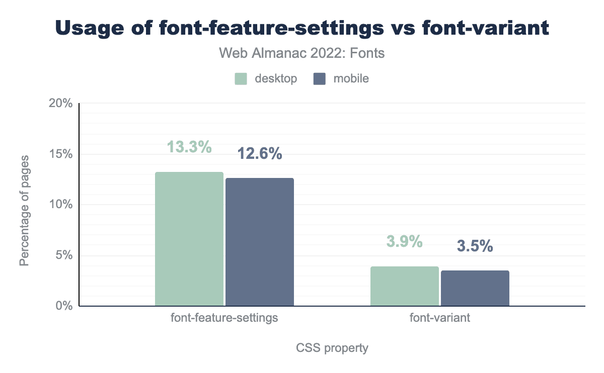 font-feature-settings is used on 13.3% of desktop pages and 12.6% of mobiles pages, and font-variant is used on 3.9% of desktop pages and 3.5% of mobile pages.Overall, usage of OpenType feature usage is quite low on the web. We were hoping most people are using the high-level font-variant properties to enable OpenType features, but their usage is even lower than font-feature-settings. The font-feature-settings property is used on 12.6% of sites, while the font-variant properties are used on only 3.5% of sites.