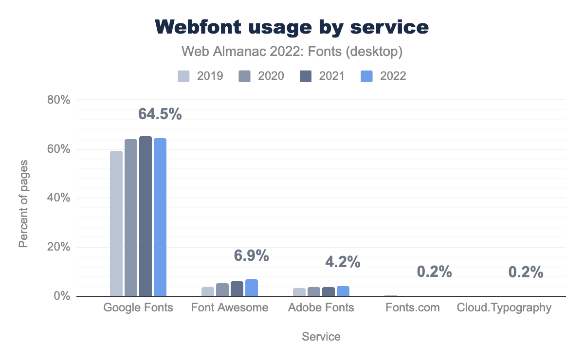Note that the services data is measured differently compared to the 2020 and 2019 font chapters. Those chapters looked at the number of requests to a service, whereas the 2022 data looks at pages using the services. Thus the data in 2022 is more accurate as it isn’t influenced by the number of fonts loaded on a site. For example, the drop in Google Fonts usage noted in the 2020 chapter was most likely caused by Google Fonts switching to variable fonts and thereby significantly reducing the number of requests to their service.