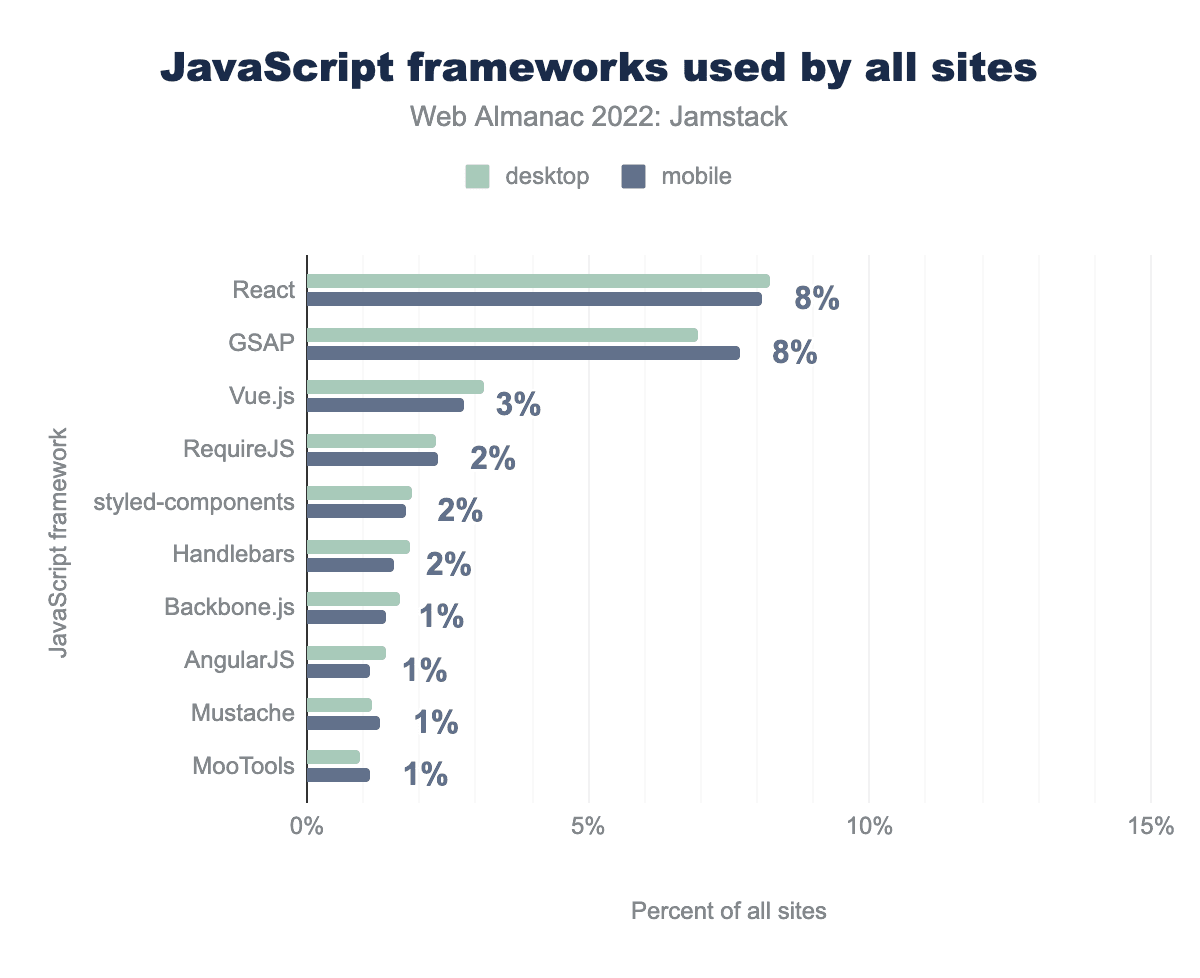We used framework identifications provided for us by Wappalyzer, which means (as we mentioned earlier) some “invisible” frameworks like Eleventy can’t be counted or analyzed.